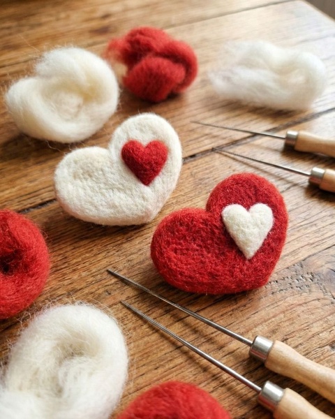 Broșă INIMĂ din lână naturală, împâslită cu acul.
