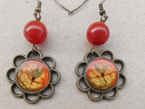 bijuterii, cercei, carneol, pietre, semiprețioase, bronz, frunze, pictat, rasina, portocaliu, maro