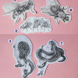 Stickere desenate tradițional in peniță, sunt grozave pentru orice tip de suprafață, de la suprafața unui laptop până la coperta unui caiet. Fiecare autocolant are o dimensiune diferită, având în general de la 3 la 10 cm: 1 - Fata care leagă șireturi - 5 x 9,5 cm 2 - Muște - 6,5 x 3 cm 3 - Muște vedere laterală - 7 x 5 cm 4 - Tigri rotund - 6 x 6 cm 5 - Pește - 9 x 3 cm 6 - Muște vedere de sus - 7 x 4 cm 7 - Fată vedere de sus - 7 x 8 cm 8 - Tigri pătrat - 6 x 6 cm 9 - Față arcaș - 4,5 x 9 cm 10 - Spate arcaș - 4 x 9 cm 11 - Arcașul așezat - 4,5 x 5,5 cm