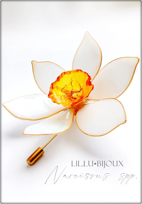 Narcisa, cu petalele sale diafane și aroma dulce, este un simbol al renasterii și al regenerării, reprezentând noi începuturi și frumusețea efemeră a vieții. Prin purtarea acestei broșe, aduci cu tine puterea naturii și energia revigorantă a primăverii.