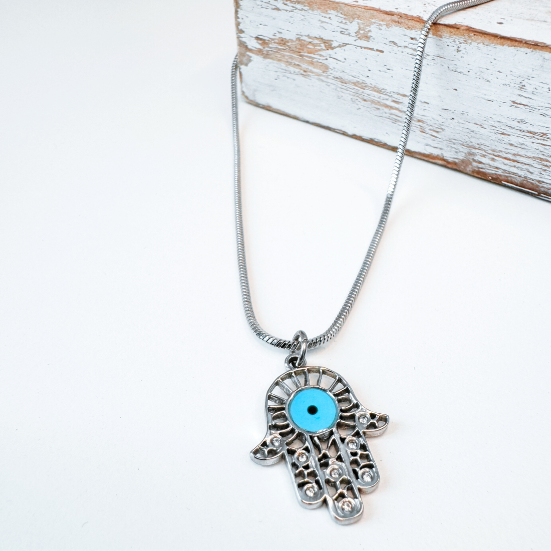 COLIER HAMSA DIN OTEL INOXIDABIL CU EVIL EYE BLEU - PROTECTIE ENERGII NEGATIVE