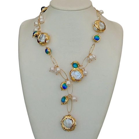 Colier unicat din perle de cultură, perle keshi aurite și mărgele de sticlă tip Murano.