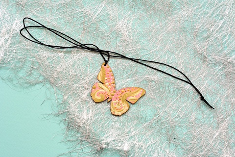 - Material: pandantiv fluture, snur bumbac, culori arilice