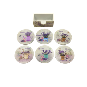 Set 6 suporti rotunzi de pahare din lemn de 9,8 cm diametru si cutie depozitare, design lavanda si fluturi, multicolori