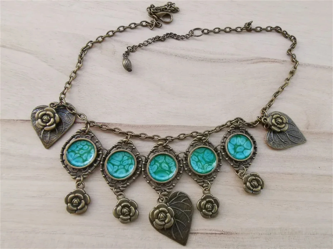 accesorii metalice de culoarea bronzului, pandative pictate, turcoaz