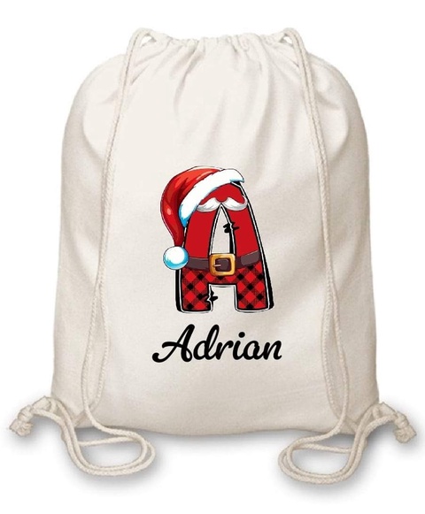 Rucsac din material tip canvas. Manerele sunt din franghie textila. Poate fi personalizat cu litera si numele copilului caruia ii este daruit. Dimensiuni: 43cm×34cm