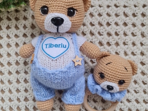Set cadou pentru bebeluși - Ursuleți croșetați manual, cu salopetă și jucărie senzorială