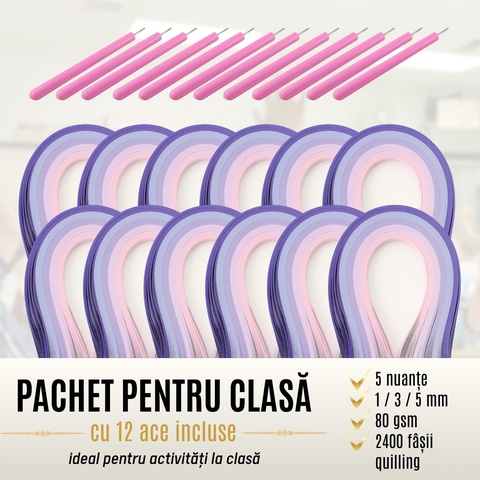 Pachet scoli cu ac inclus - hartie quilling colectie 5 nuante de mov - latime 1 mm/3 mm/5 mm - pentru 12 elevi