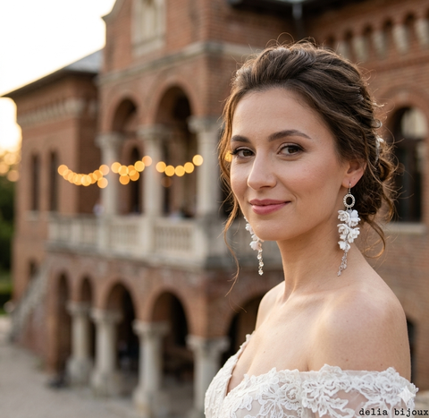 Cercei lungi handmade unicat cu flori si cristale - Ideali pentru nunta, botez, cununie (cod1300)
