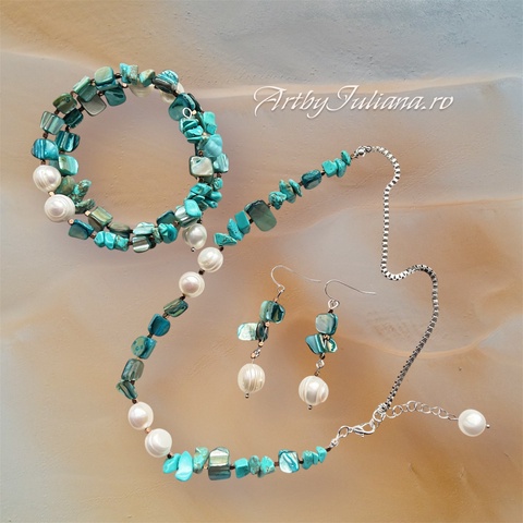 Set (colier, cercei, brățară) pietre semiprețioase și perle "Valurile mării"