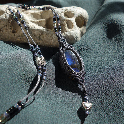 Acest colier micro-macrame este realizat manual, din șnur cerat rezistent. Piesa centrală este un pandantiv cu labradorit natural. Este un accesoriu pe care îl poți purta zi de zi, dar care iese totuși în evidență prin textură și combinația de culori.