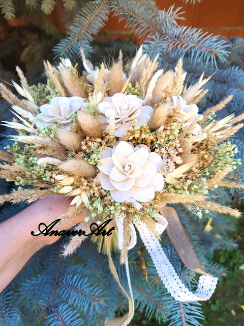 - Material: dantela, panglica yuta, plante uscate, sfoara, trandafir lemn, flori uscate, flori stabilizate