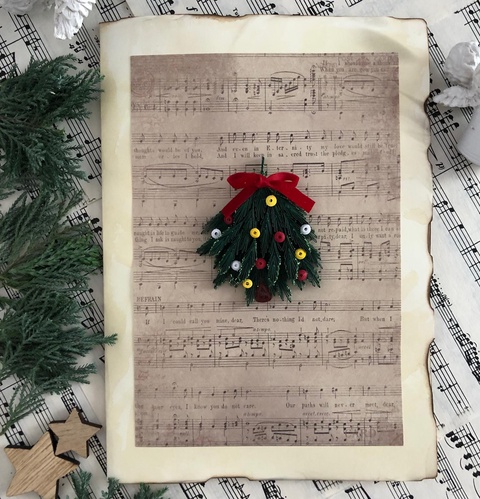 - Material: fâșii de hârtie quilling 2-3mm, sclipici verde, carton ivory
