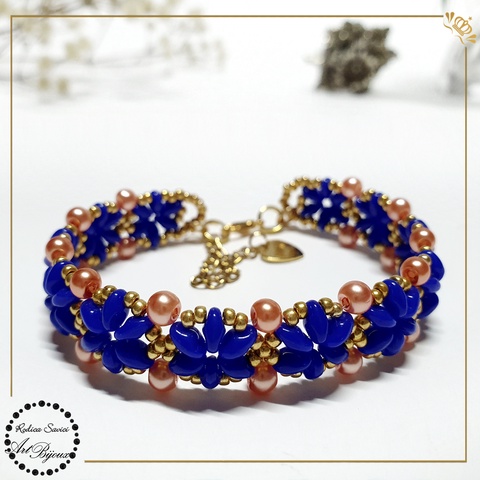 BRĂȚARĂ cu floricele albastru+roz+auriu