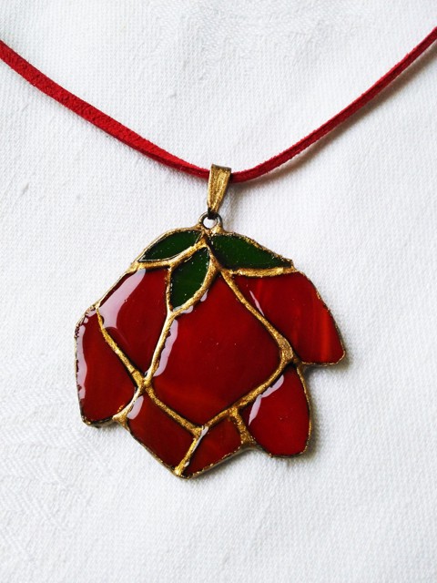 - Material: fusing sticlă roșu, vitralii, lac de sticlă 3d, piese pandantiv, curea din piele roșie, sticlă wissmach verde