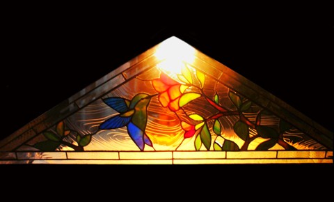 spectrum verde măsliniu, wissmach verde deschis, sticlă spectrală incoloră cu o suprafață ondulată, wismach portocaliu roz, lipire din aliaj de plumb și staniu, folie de cupru, uólomprofil, sticlă fațetată, patină
