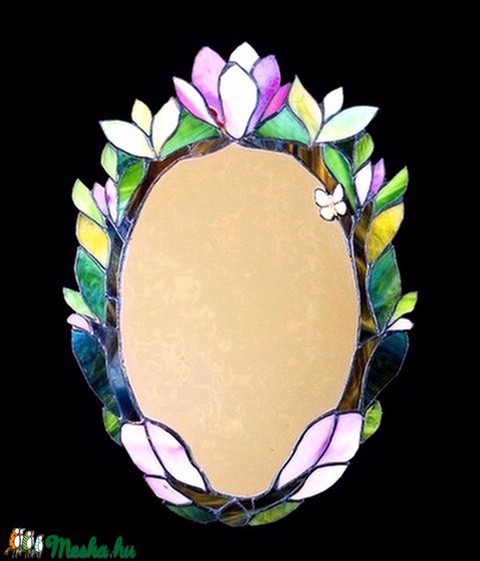 - Material: wissmach sticlă verde deschis, sticlă wissmach verde închis, sticlă wissmach roz, wissmach galben-verde, wissmach barna, sticlă oglindă, folie de cupru, patină, lipire din aliaj de plumb și staniu, umeraș de cupru