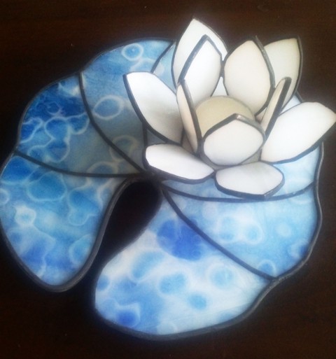 spectrul de sticlă alb, sticlă cu dop albastru deschis, lipire din aliaj de plumb și staniu, folie de cupru, patină, margele de sticlă, u olomprofil