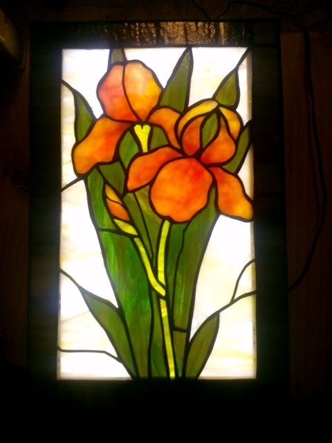 - Material: wissmach zöld, uroboros galben, spectrum alb -bej, material de plumb, cadru din sticlă neagră, bec luminat
