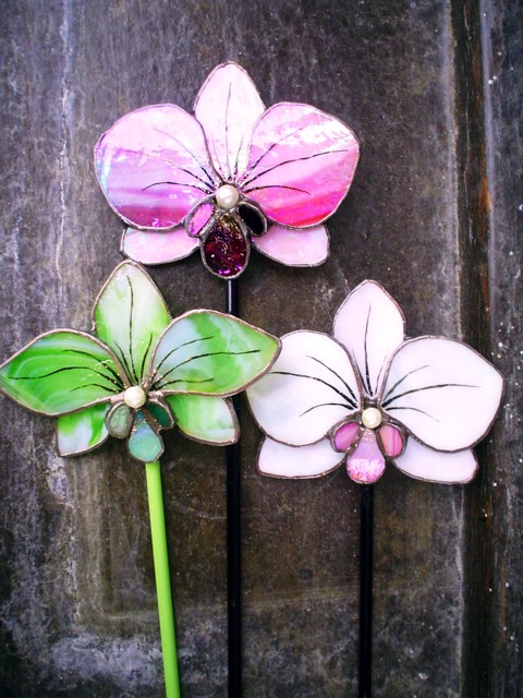 sticlă wissmach alb iridescent, wissmach roz, wissmach verde pal, v. galben, folie de cupru, patină, lipire din aliaj de plumb și staniu, tijă de sticlă 50cm, pearl scroll roz, alb, sticlă contur negru, lac