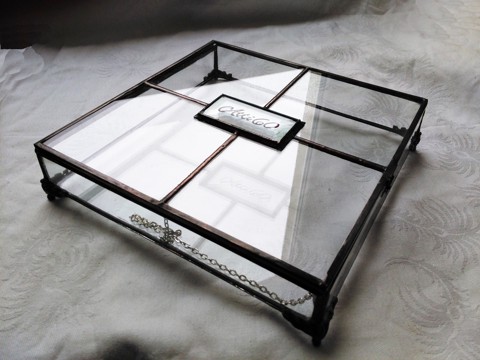 sticlă naturală 4mm, lipire din aliaj de plumb și staniu, cizme pe sticlă, uólomprofil, balama și folia de cupru, picioare antice, patină, componentă de închidere a cutiei