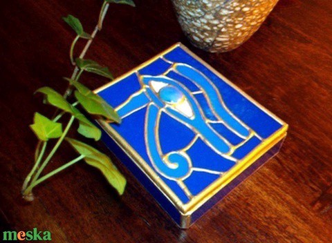 - Material: spectrum olal albastru închis, spectrul de sticlă opal albastru mediu, lipire din aliaj de plumb și staniu, balama și folia de cupru, patină, margele de sticlă, hobby -aranypor, lac