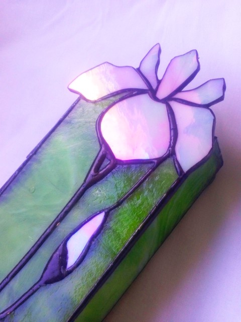 - Material: wissmach verde deschis, spectrul alb iridescent, folie de cupru și profil u.lead, lipire plumb staniu, margele de sticlă verzi, patină, vernisaj