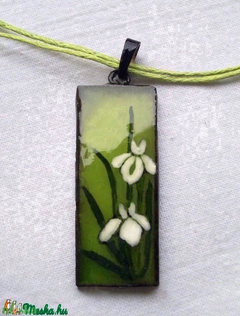 - Material: sticlă wissmach verde, folie de cupru, patină, lipire, vopsea de sticlă, lac de sticlă 3d, clip pandantiv, curea din piele
