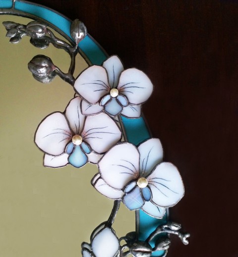 spectru de sticlă albastru cian, wissmach sticlă albă, wissmach iridescent alb-deschis, sticlă oglindă, folie de cupru, lipire din aliaj de plumb și staniu, patină, fir de cupru, uólomprofil, perle