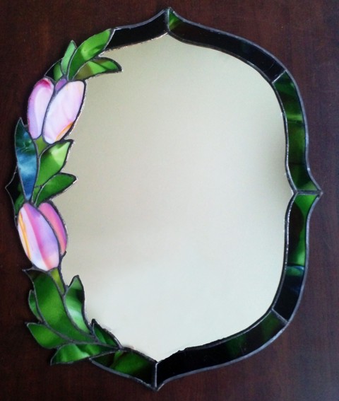uroboros sticlă verde, sticlă wissmach roz, oglindă din sticlă, folie de cupru, lipire din aliaj de plumb și staniu, patină, umeraș de cupru, uólomprofil
