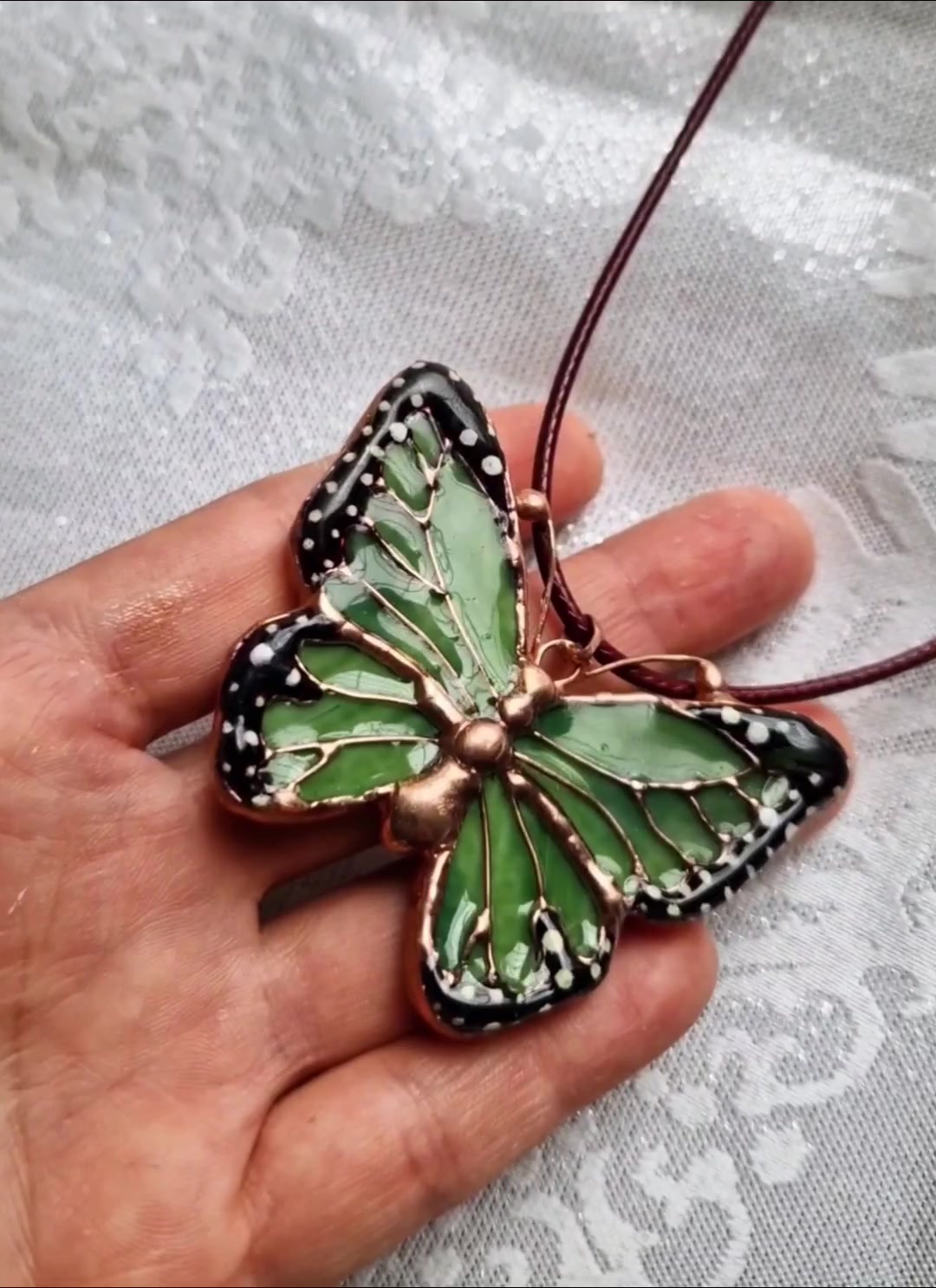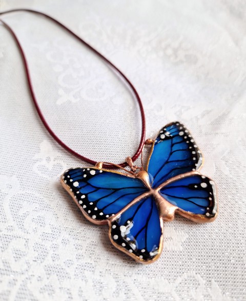 - Material: folie de cupru, patină, lipire, vopsea de sticlă, lac de sticlă 3d, clip pandantiv, curea din piele, sticlă armstrong albastru cobalt, frunză de sticlă bullseye verde