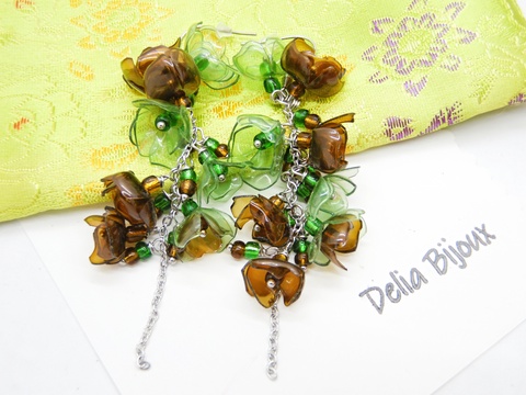 Cercei statement unicat flori verzi-maro handmade din plastic reciclat si inox (cod1307)