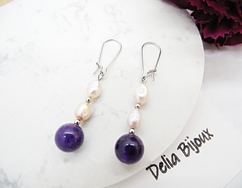 Cercei handmade cu ametist natural și perle de cultură bijuterii elegante unicat (cod1303)