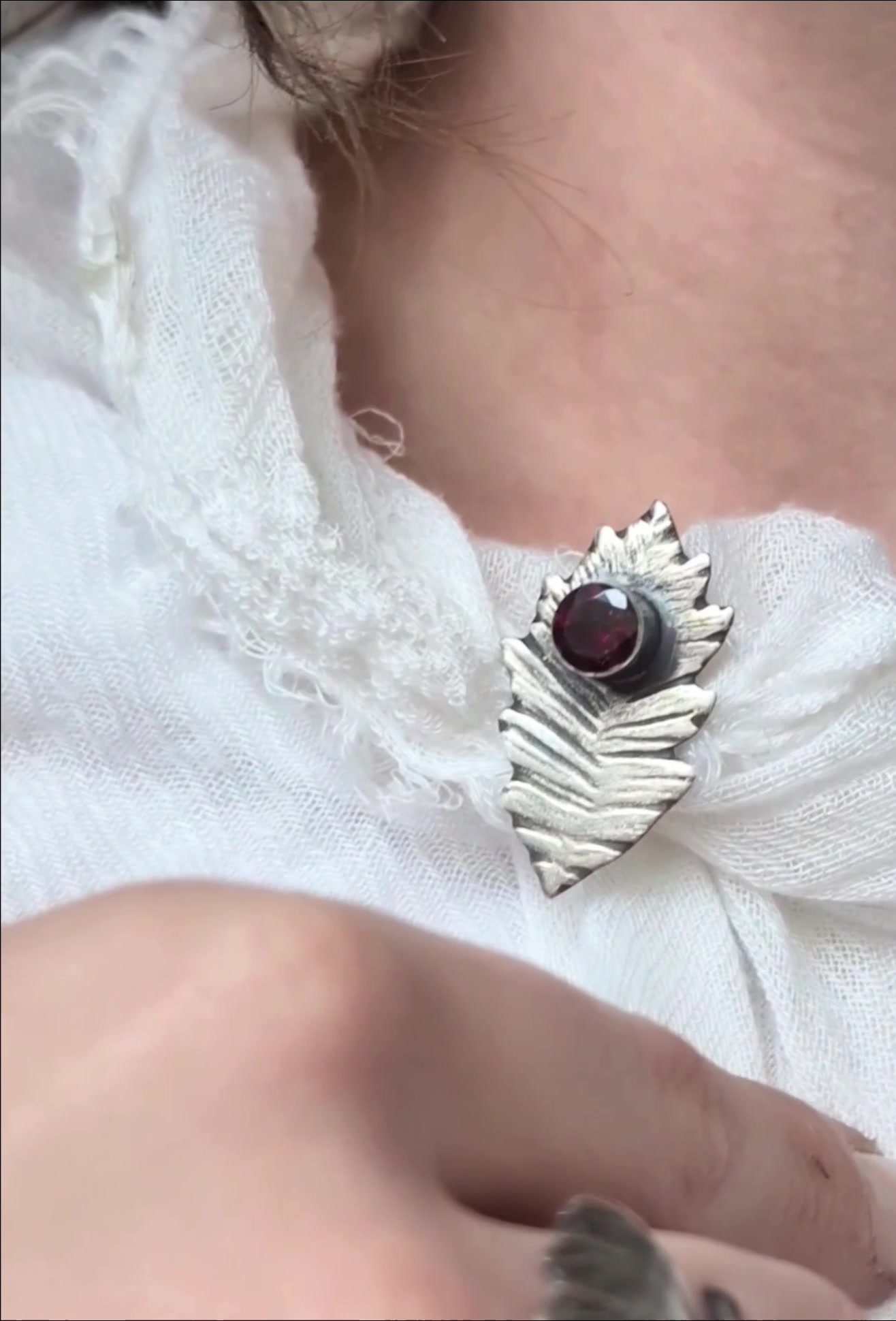 O frunză sculptată manual în argint, cu texturi organice și forme fluide. În centrul ei arde un granat rotund fațetat, simbol al vitalității și al curajului.