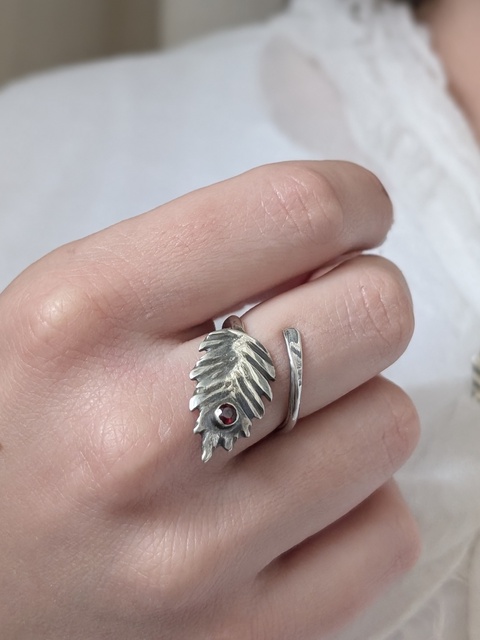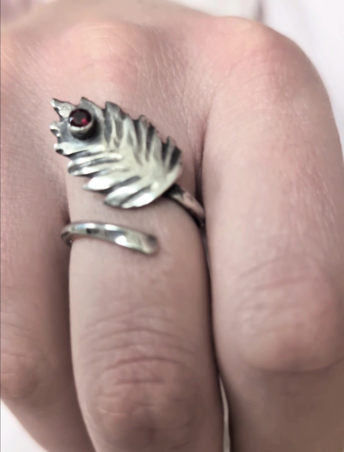 Inel reglabil din argint, modelat manual și decorat cu o frunză sculptată ce învăluie un granat adânc roșu. Designul organic și textura vie sugerează energia transformării.