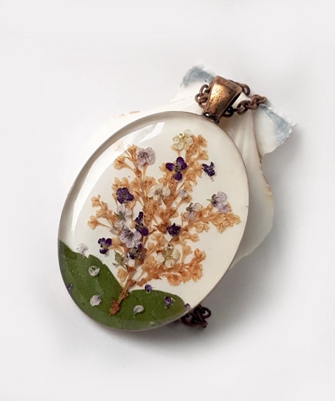 - Material: rasina, flori naturale, frunze naturale, elemente metalice cuprate