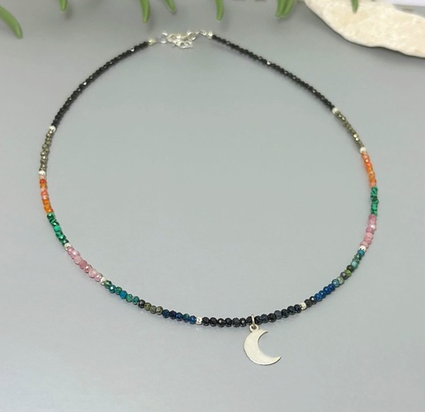 Colier safir, turmalina, crisocola, malachit, pirita si pandantiv semiluna