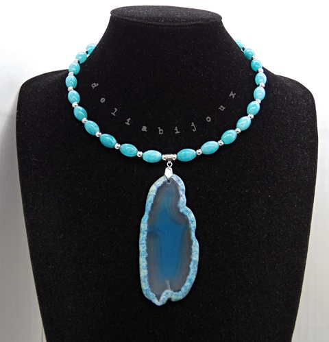 Un colier handmade elegant și plin de personalitate, realizat manual din materiale naturale. Piesa centrală este un pandantiv masiv (8 cm) din felie de agat albastru-gri-bleu-turcoaz, cu texturi și nuanțe spectaculoase care atrag privirea.