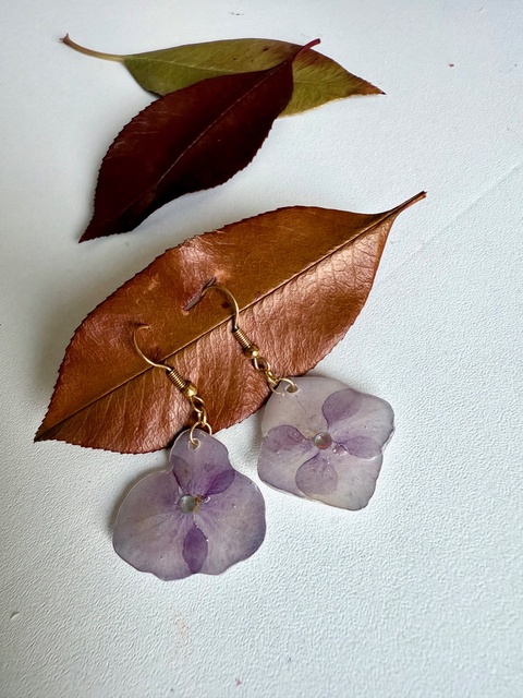 Cercei din rasina si floare naturala de hortensie
