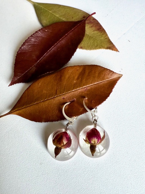 Cercei din rasina cu boboc trandafir natural