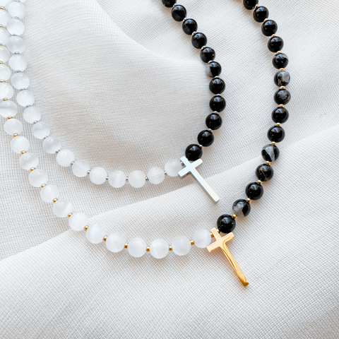 Colier la baza gatului din selenit si turmalina neagra cu pandativ cruce