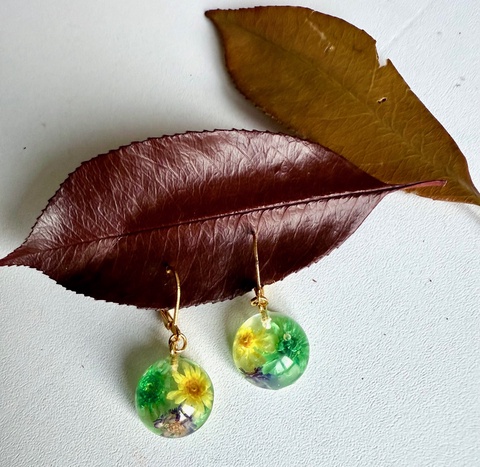 Cercei din rasina cu flori naturale verde-galben