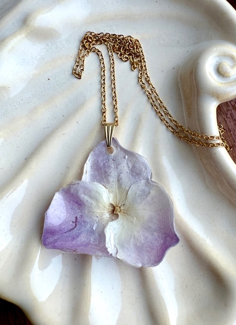 Pandantiv handmade unicat cu floare naturala de hortensie si rasina.