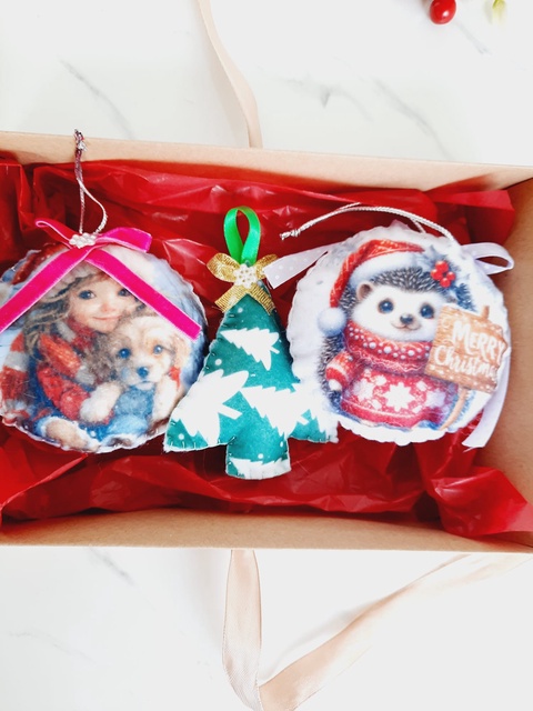 Globurile sun confectionate din fetru imprimat, decupate si cusute manual, umplute cu vatelina. Sunt decorate cu funde. Se prezinta in set de 3 buc. cu modele diferite, in cutie craft cu hartie de matase, cu panglica si minifelicitare de Craciun. Au diametrul de 9 cm, iar bradutul are 14 cm.