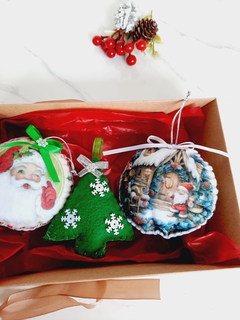 Globurile sun confectionate din fetru imprimat, decupate si cusute manual, umplute cu vatelina. Sunt decorate cu funde. Se prezinta in set de 3 buc. cu modele diferite, in cutie craft cu hartie de matase, cu panglica si minifelicitare de Craciun. Au diametrul de 9 cm, iar bradutul are 14 cm.