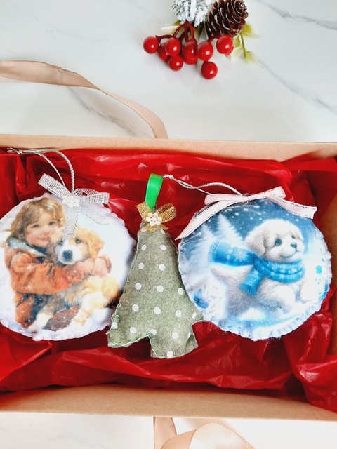 Globurile sun confectionate din fetru imprimat, decupate si cusute manual, umplute cu vatelina. Sunt decorate cu funde. Se prezinta in set de 3 buc. cu modele diferite, in cutie craft cu hartie de matase, cu panglica si minifelicitare de Craciun. Au diametrul de 9 cm, iar bradutul are 9 cm.