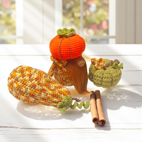 Set croșetat rustic de toamnă – gnom cu cap de dovleac, dovleac rotund și dovleac alungit – Lalyloop MagicCraft