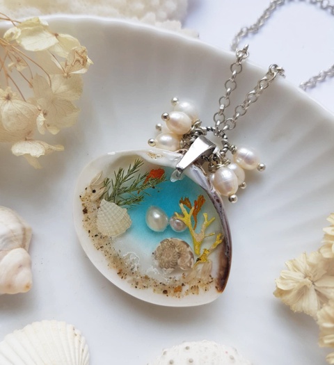 otel inoxidabil, rasina, flori naturale, scoica naturala, nisip, muschi, pigment, perle naturale de apa dulce albe