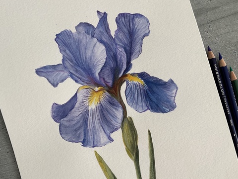 Tablou pictura in acuarela si creioane colorate floare Iris