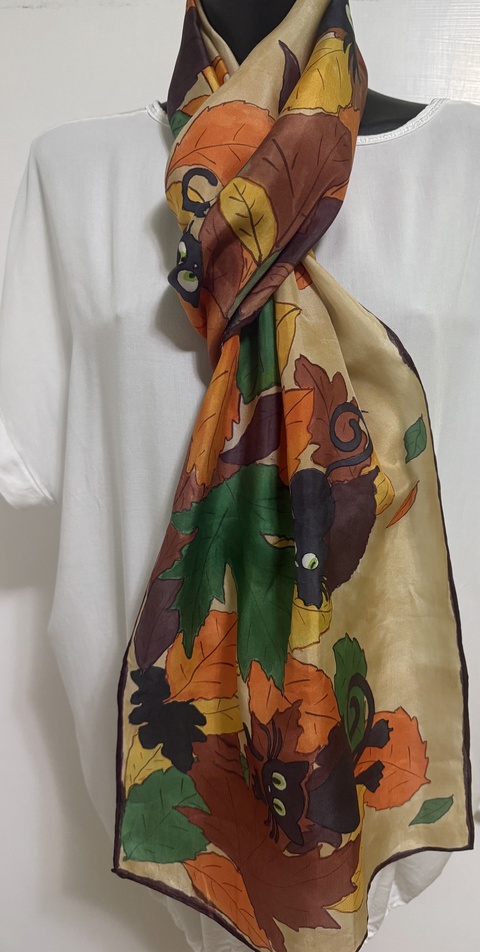 Eșarfă din mătase pictată manual, cu pisici negre – atmosferă de toamnă
